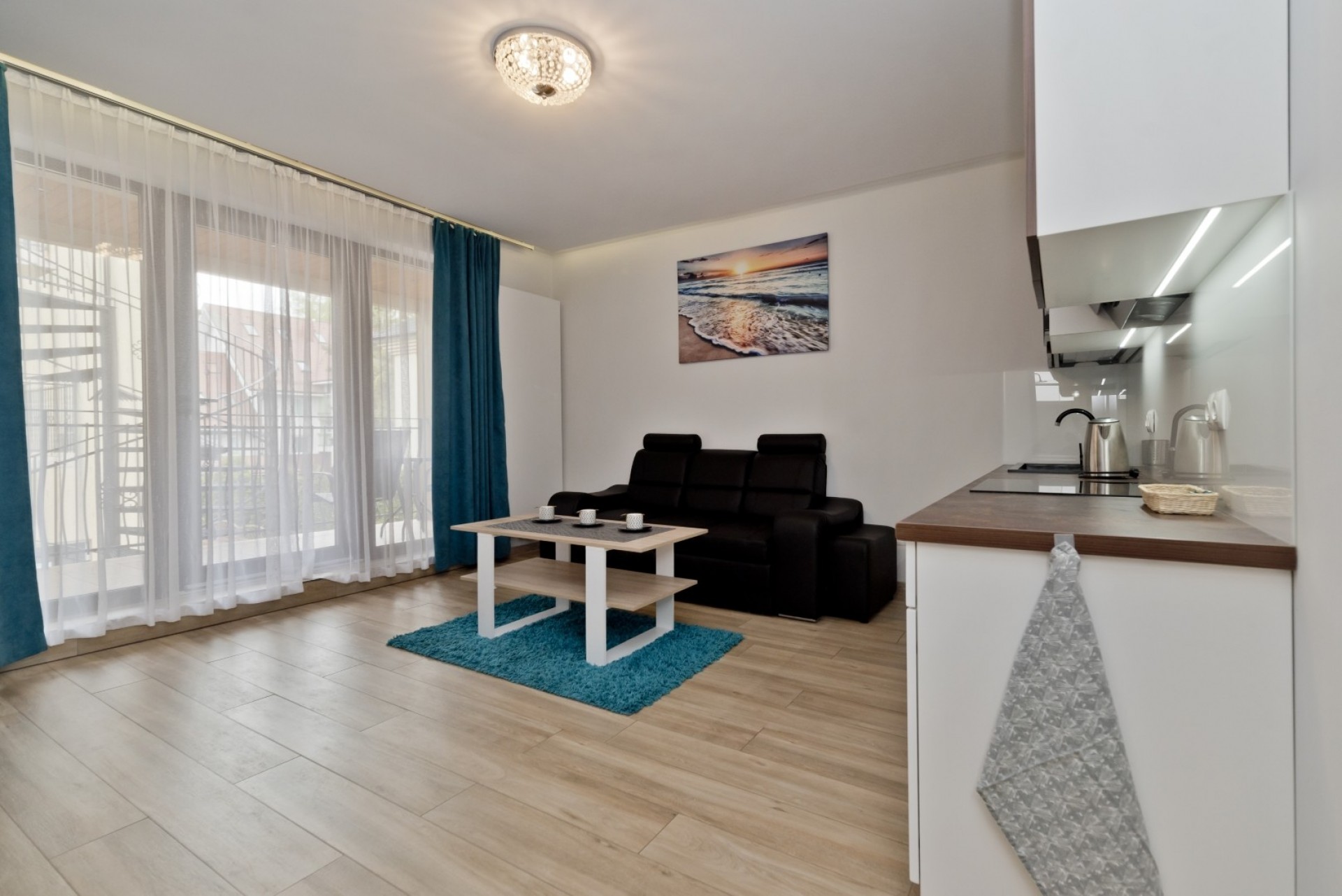 Znajduje się w nich duże łoże małżeńskie, w salonie sofa rozkładana, łazienka i kuchnia z płytą indukcyjną, lodówką, mikrofalą i czajnikiem.