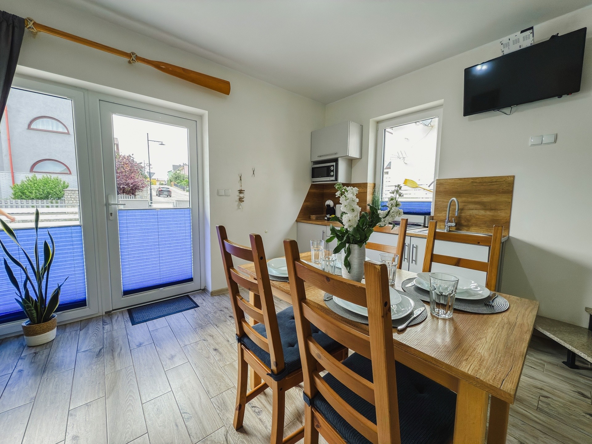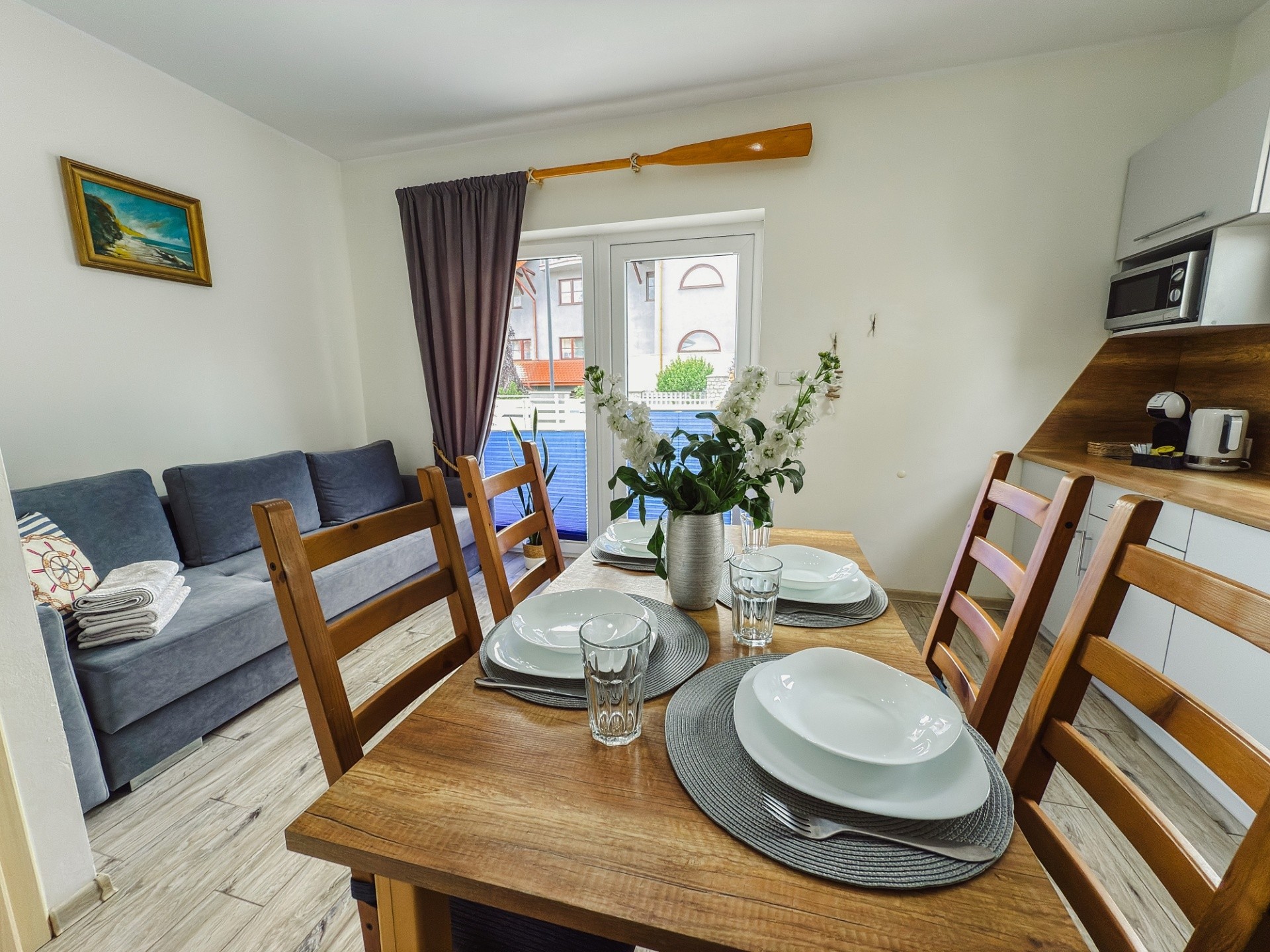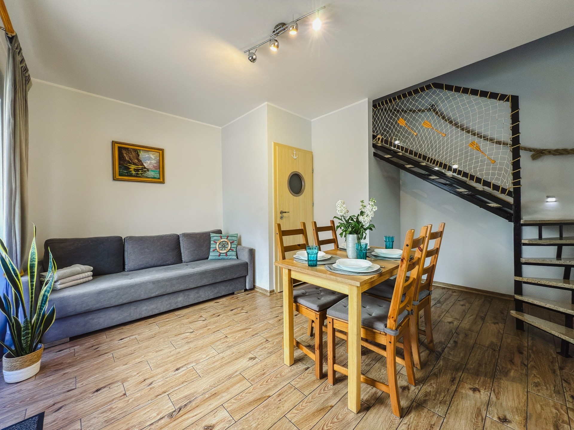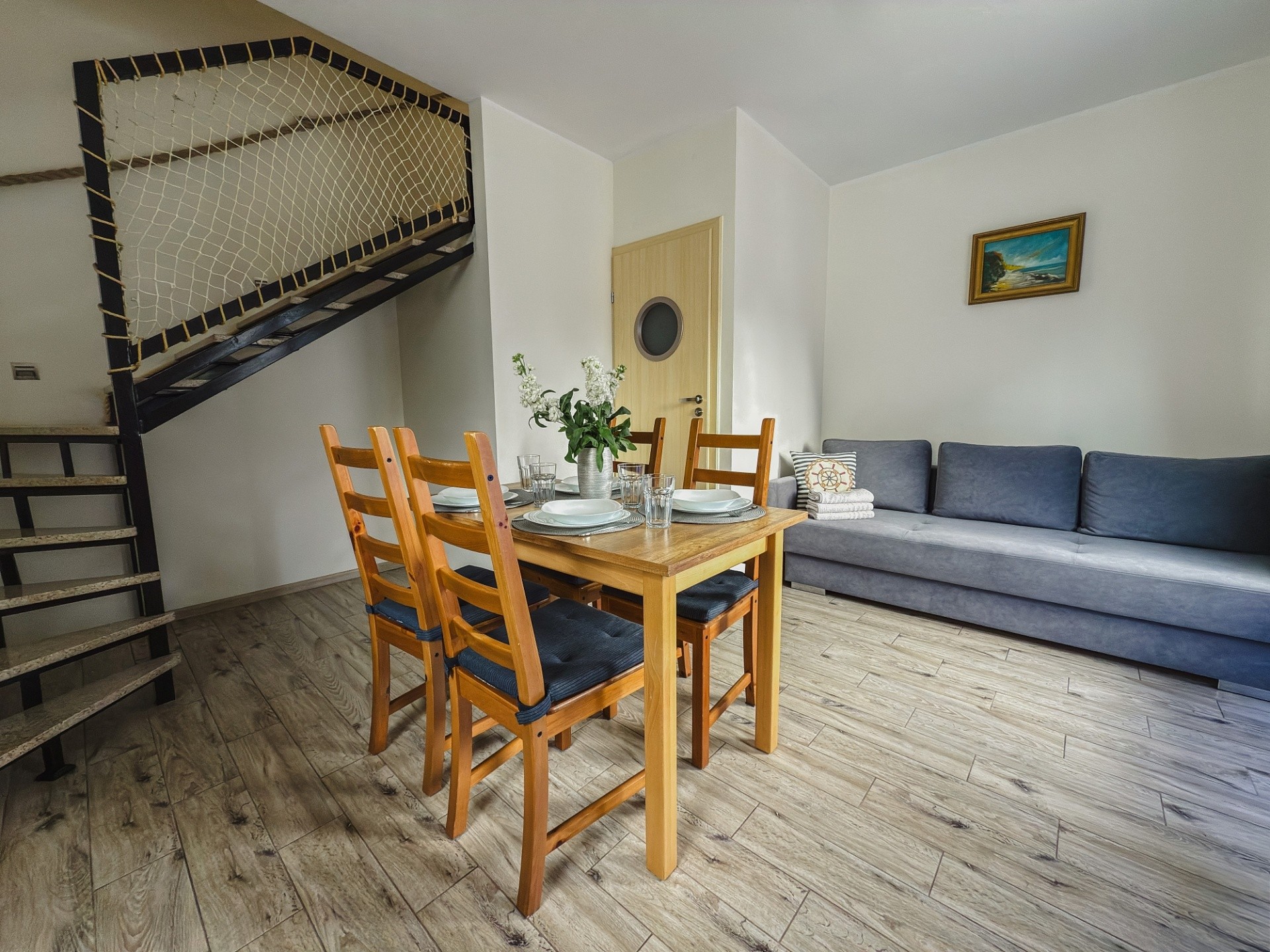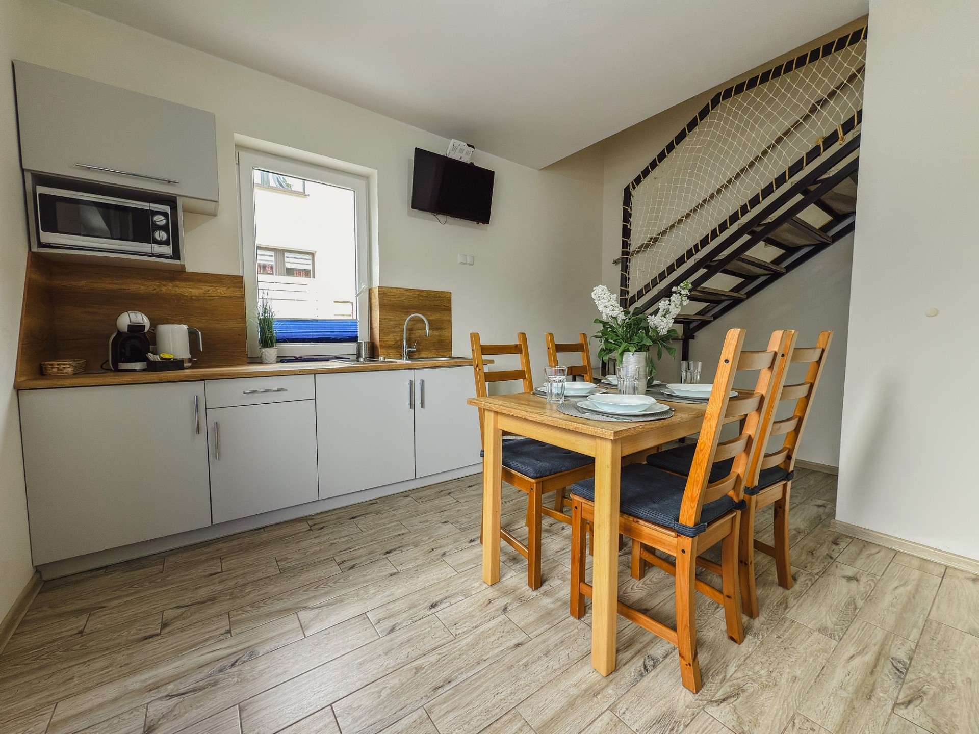 Każdy apartament posiada dwa poziomy. Parter to przestronny salon z rozkładaną, dwuosobową wygodną sofą i telewizorem, łazienka z prysznicem oraz aneks kuchenny. Aneks kuchenny jest wyposażony w: dwupalnikową kuchenkę elektryczną, kuchenkę mikrofalową, czajnik elektryczny, lodówkę, zestaw garnków, sztućce, ekspres kapsułkowy, zestaw talerzy oraz naczyń do napojów zimnych i gorących.