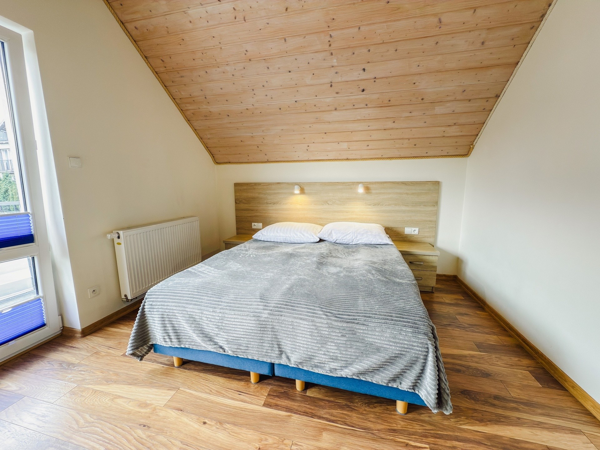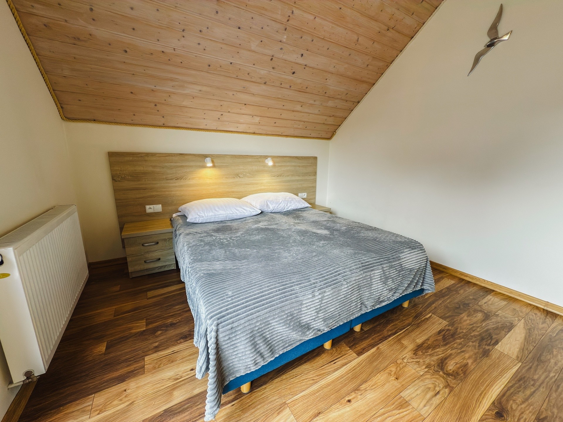 Na piętrze znajduje się sypialnia z dwuosobowym łożem małżeńskim lub dwoma osobnymi łóżkami hotelowymi, szafą oraz komodą. W trzech apartamentach (nr2, nr3 i nr4) w sypialni jest dodatkowe łóżko.