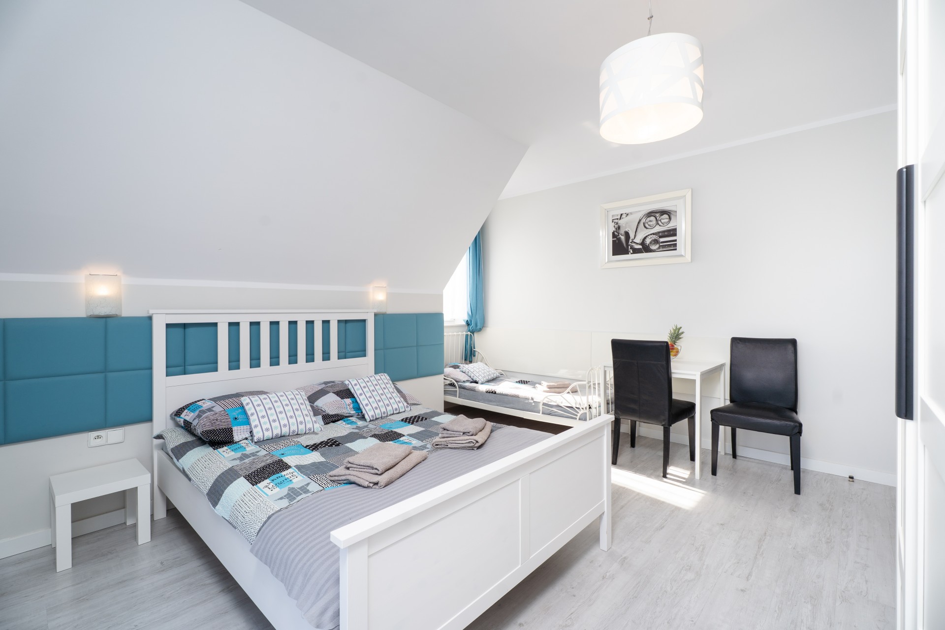 Dwie sypialnie w każdej (1 łoże małżeńskie oraz 1 łoże pojedyncze, stolik nocny, komoda, pościel, lampka nocna);