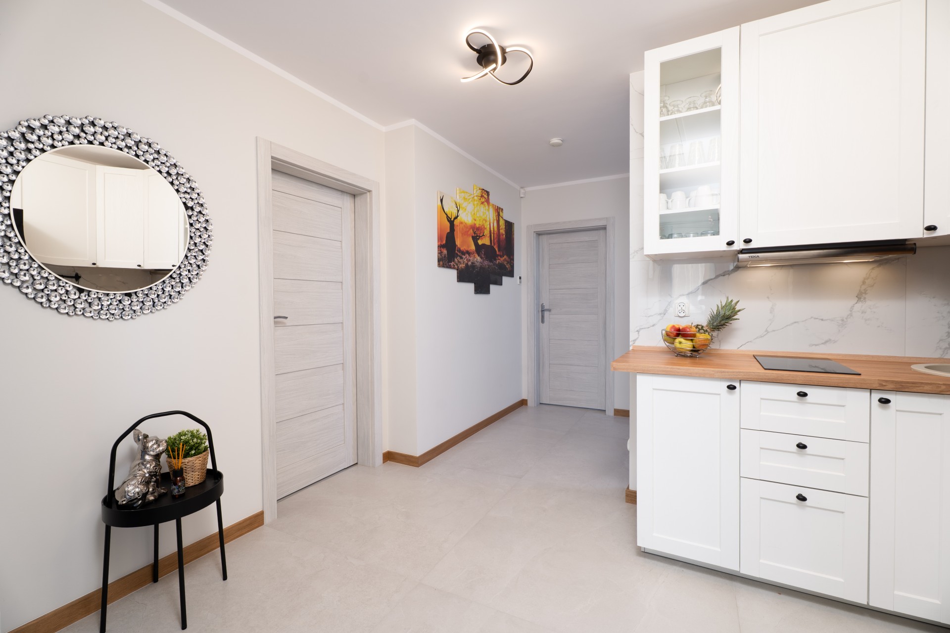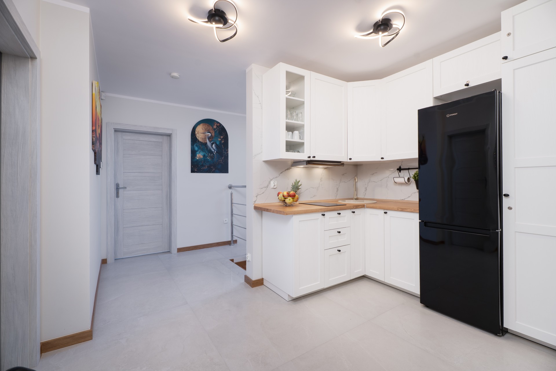 Aneks kuchenny (kuchenka z płytą indukcyjna, okap, czajnik, lodówka, mikrofalówka, zmywarka, naczynia, garnki, patelnia, sztućce, stół z krzesłami.