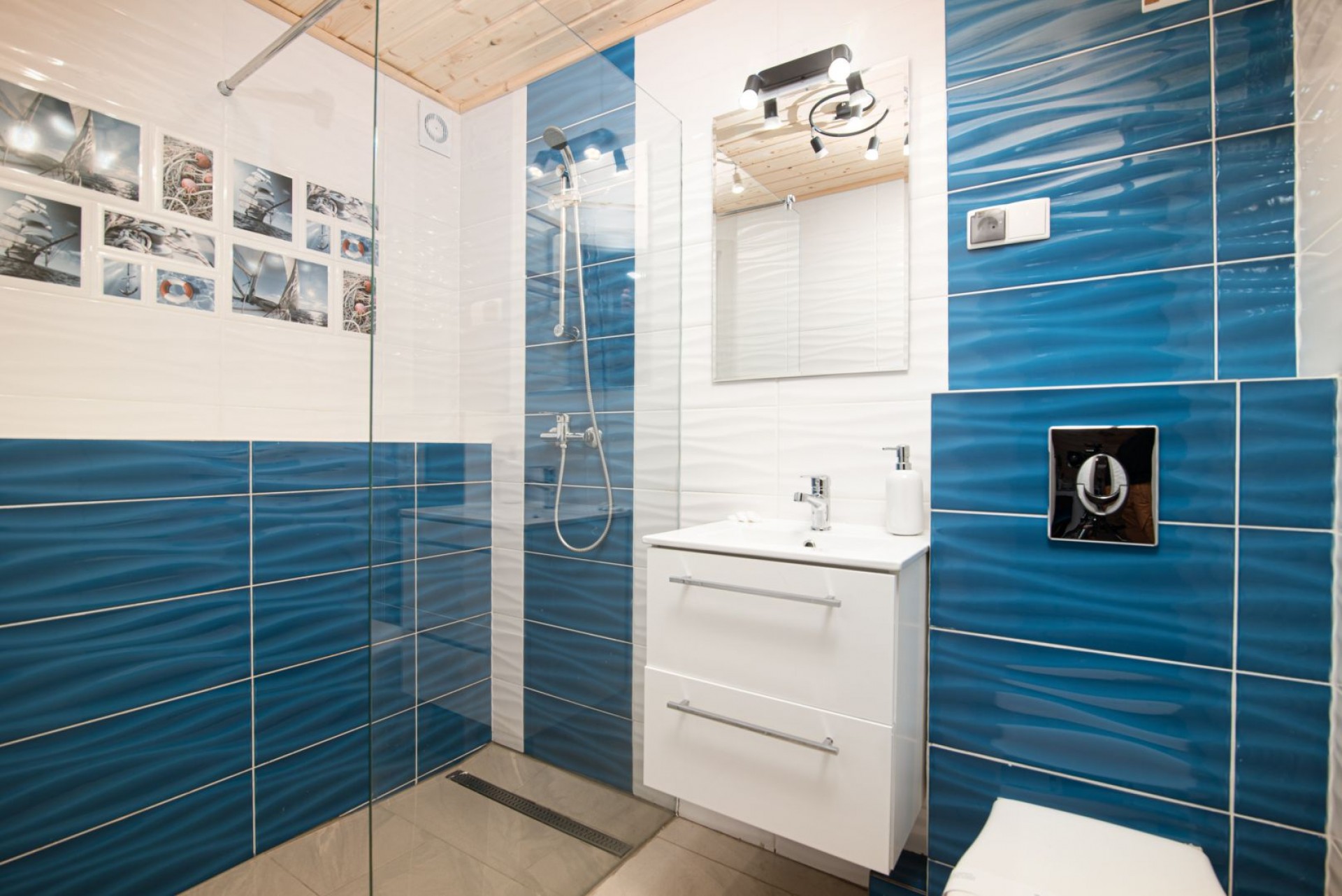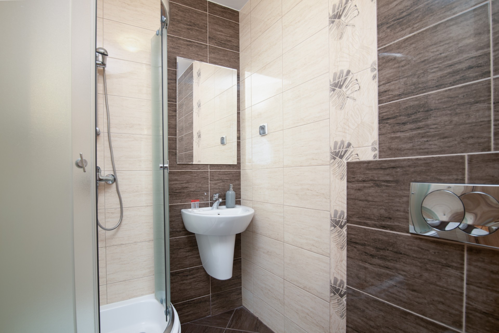 Łazienka (WC, kabina prysznicowa, umywalka, ręczniki, mydełko, szampon);