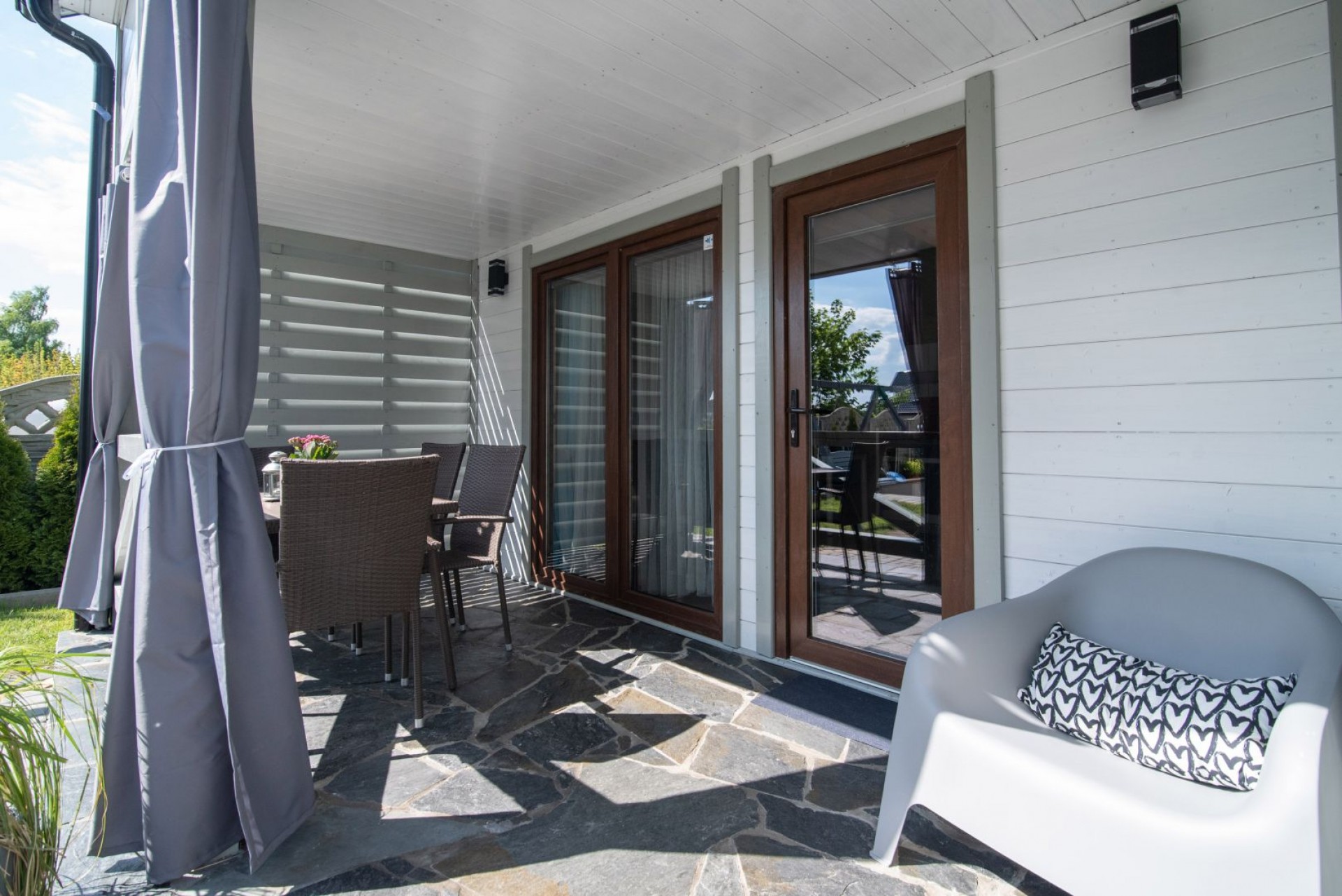 Domek posiada niezależne wejście, zadaszony taras o powierzchni ok 10 m2 wraz z meblami wypoczynkowymi gdzie można spożywać posiłki, a w letnie wieczory usiąść z lampką wina.