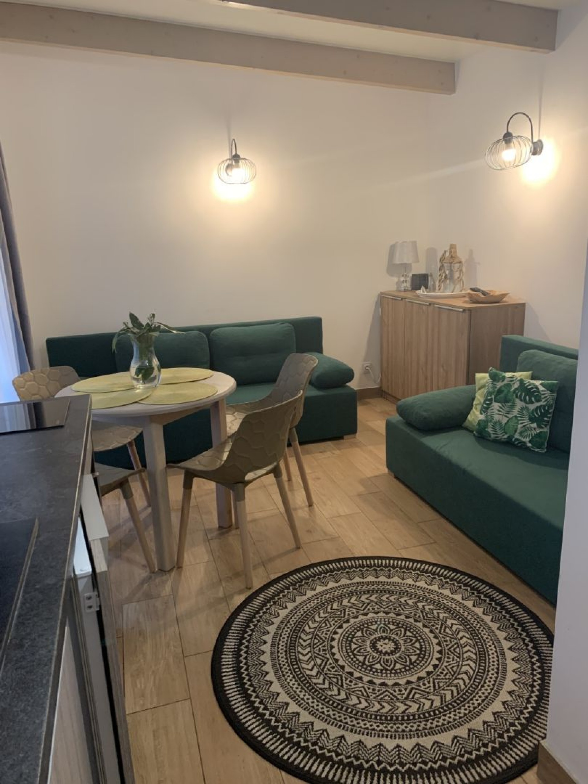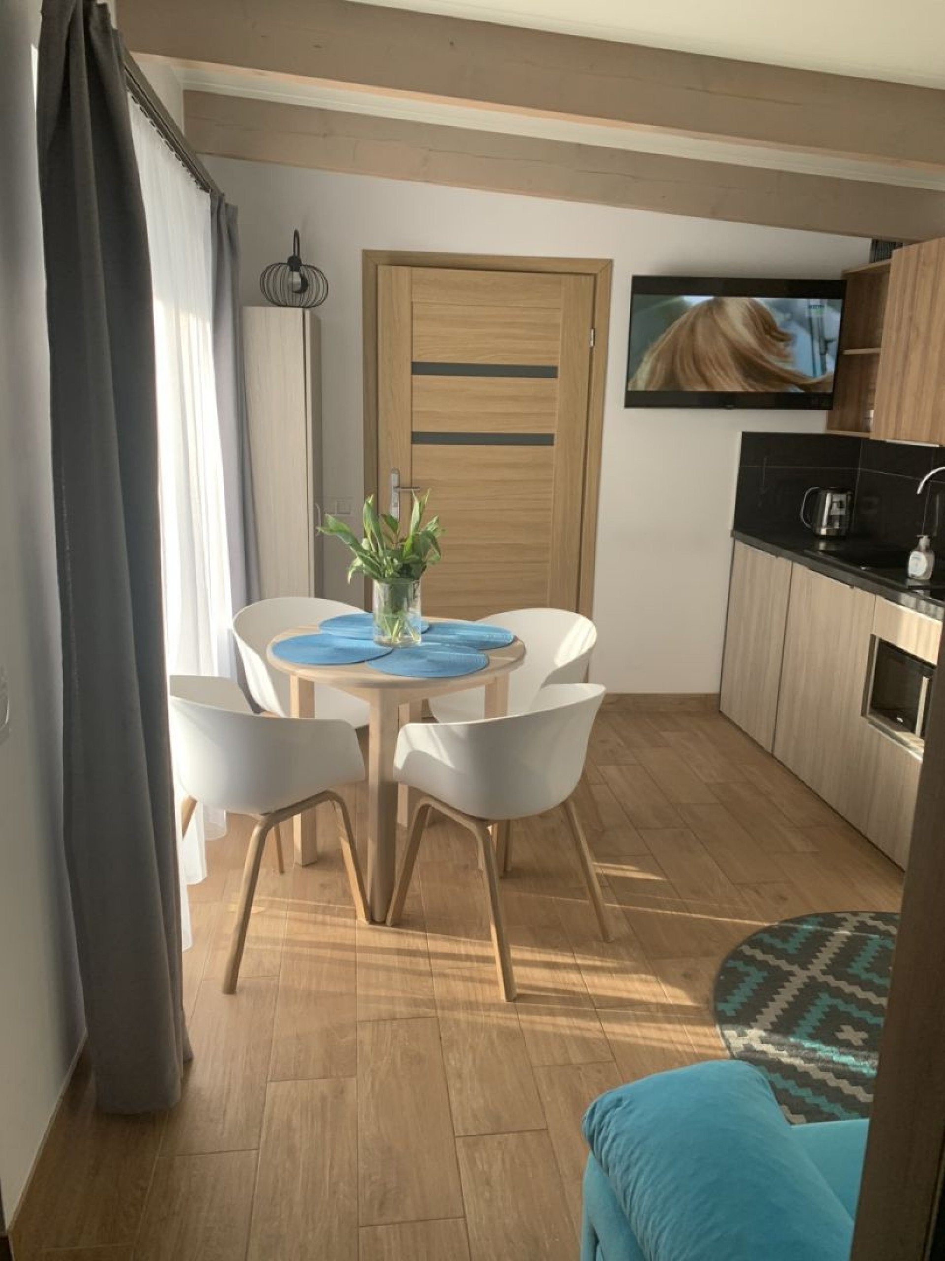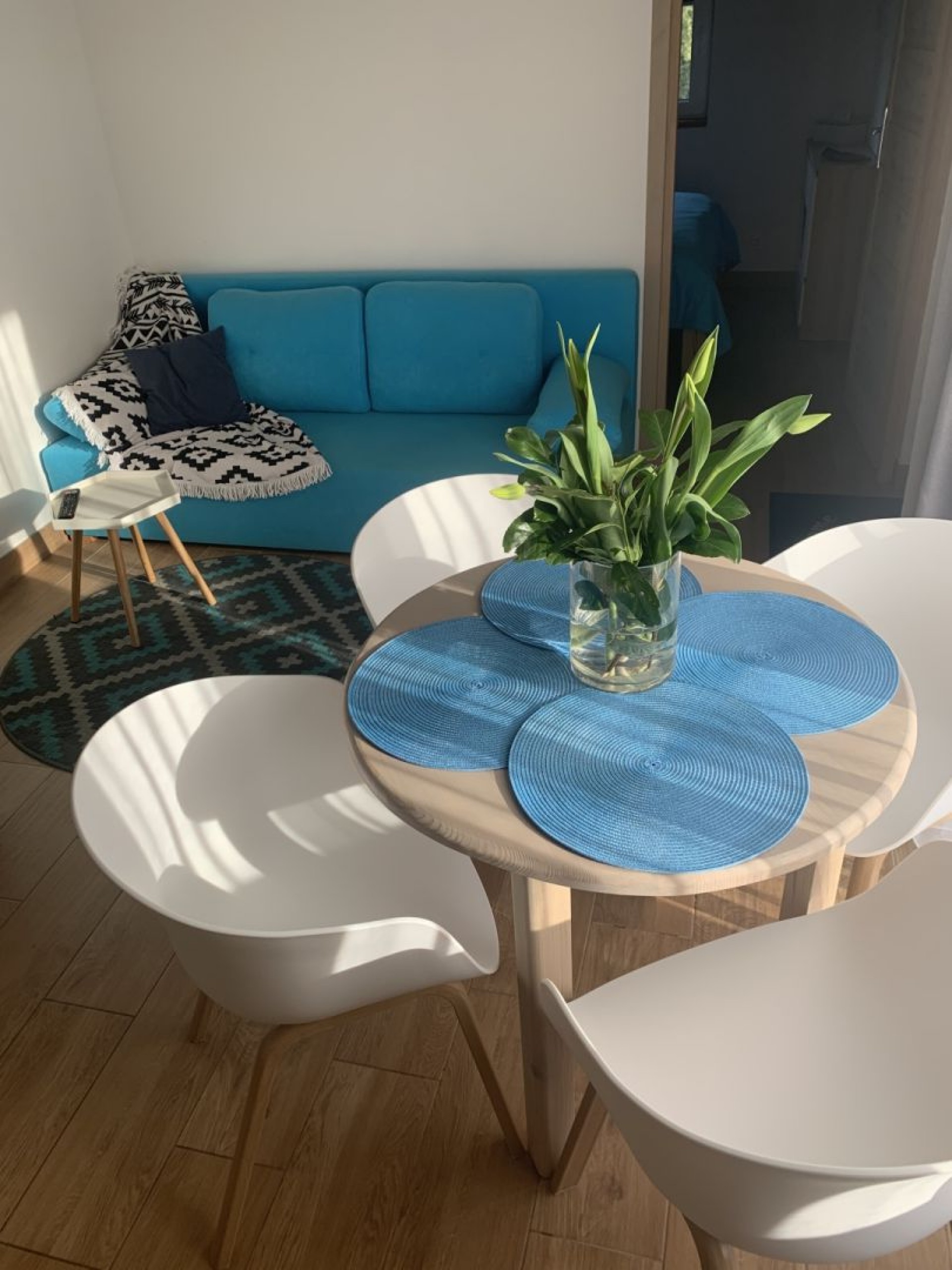 W salonie znajduje się telewizor oraz rozkładane kanapy, bardzo wygodne do spania. Salon posiada w pełni wyposażony aneks kuchenny, w którym znajdą Państwo zarówno lodówkę, mikrofalówkę, płytę kuchenną, czajnik, jak i zestaw najpotrzebniejszych naczyń, a także stół i cztery krzesła. Bezpośrednio z salonu mamy wyjście na murowany taras z meblami ogrodowymi.