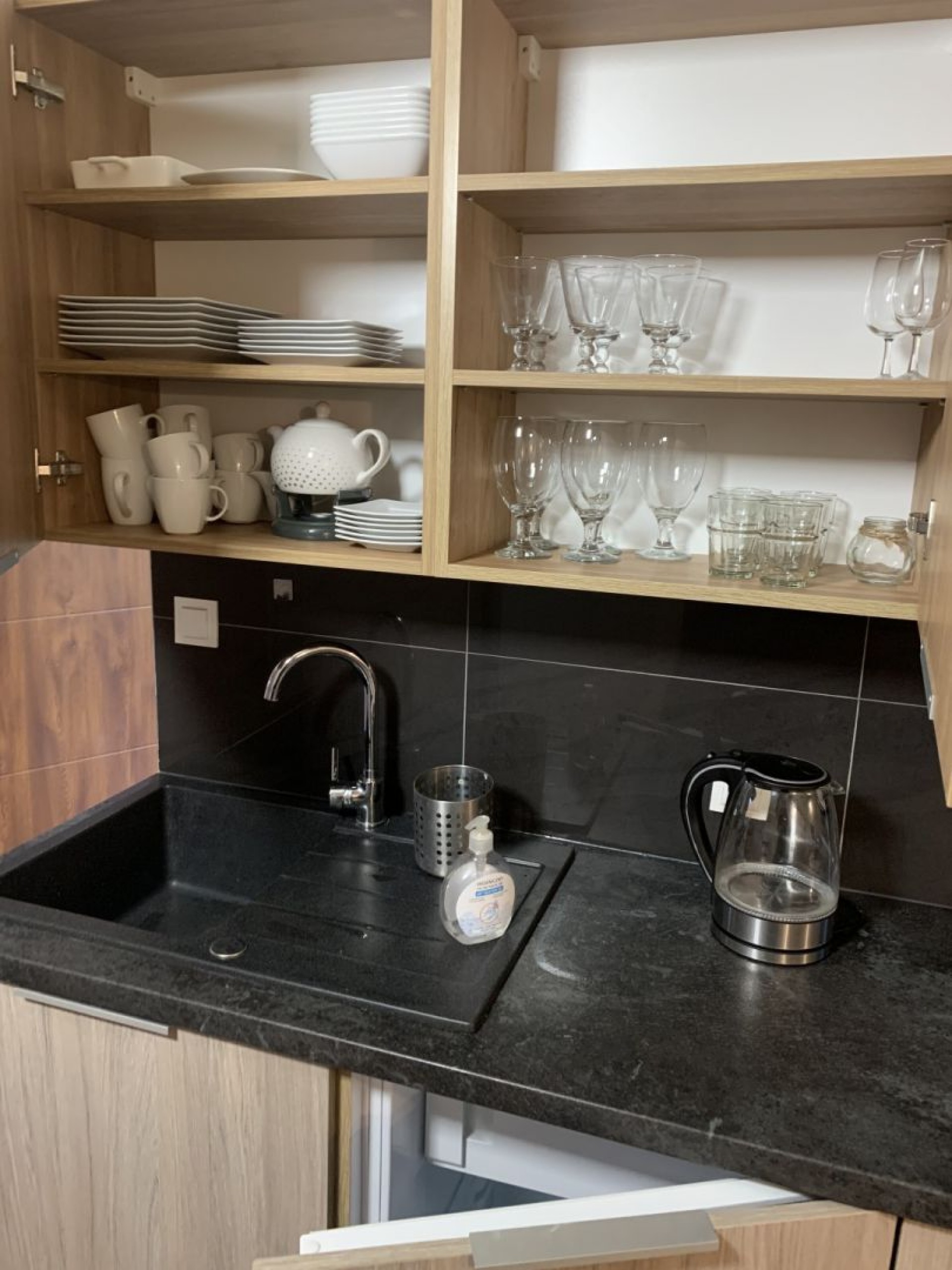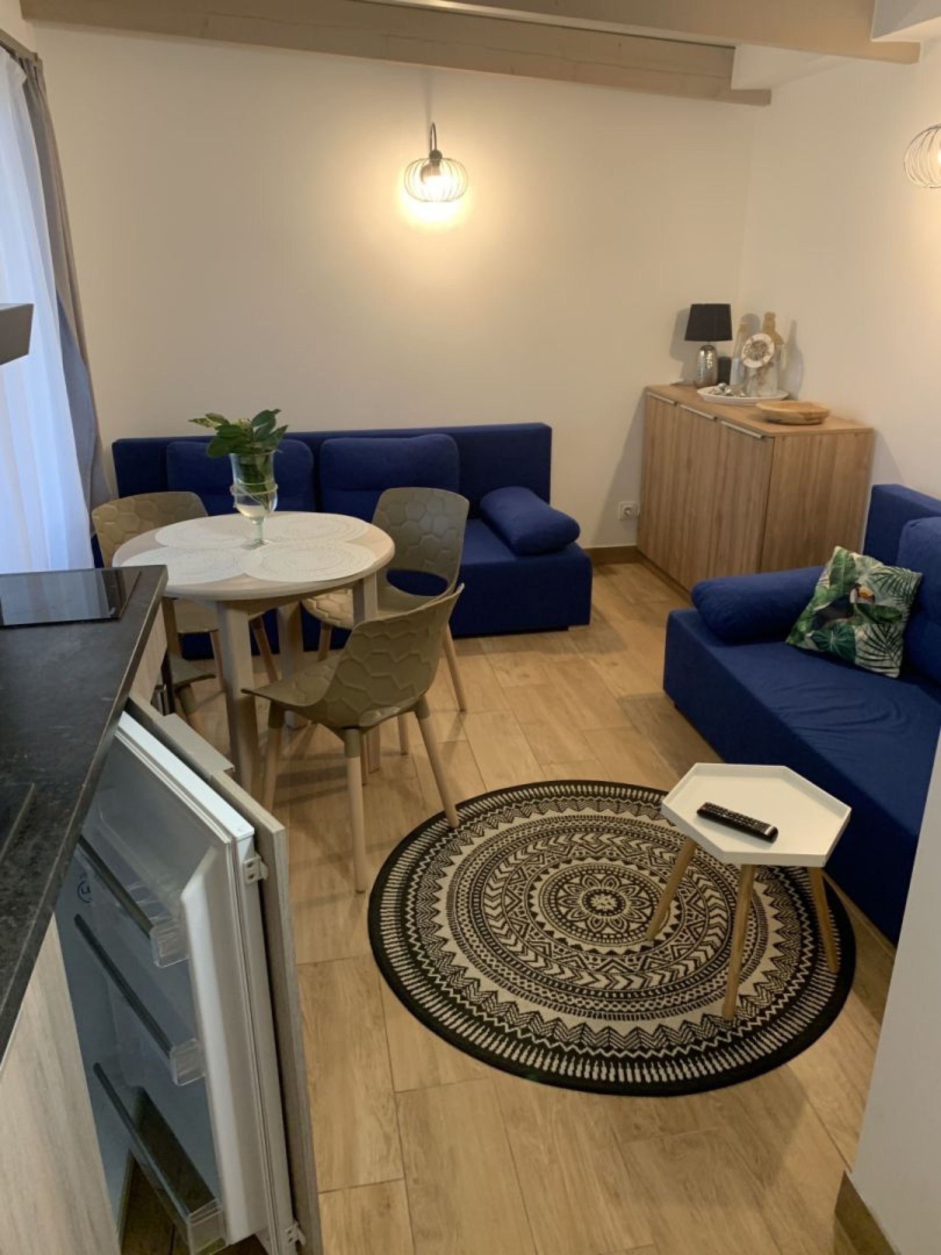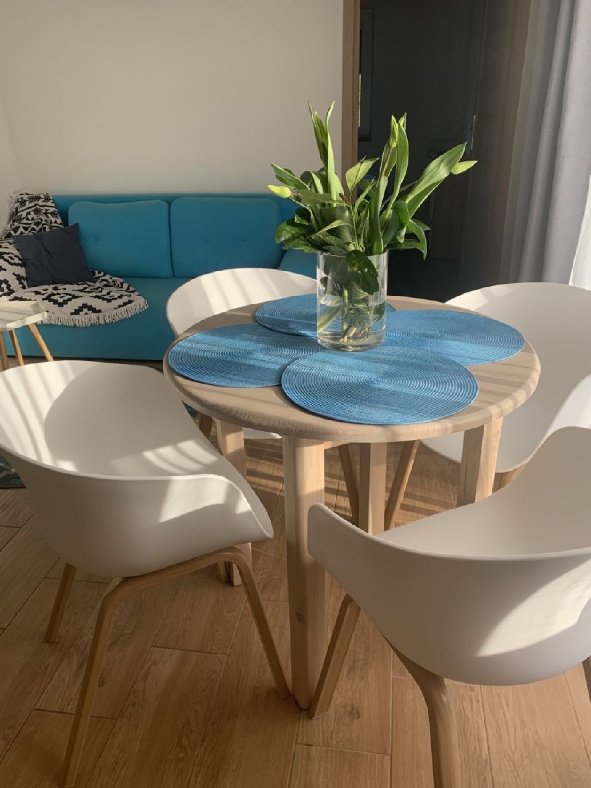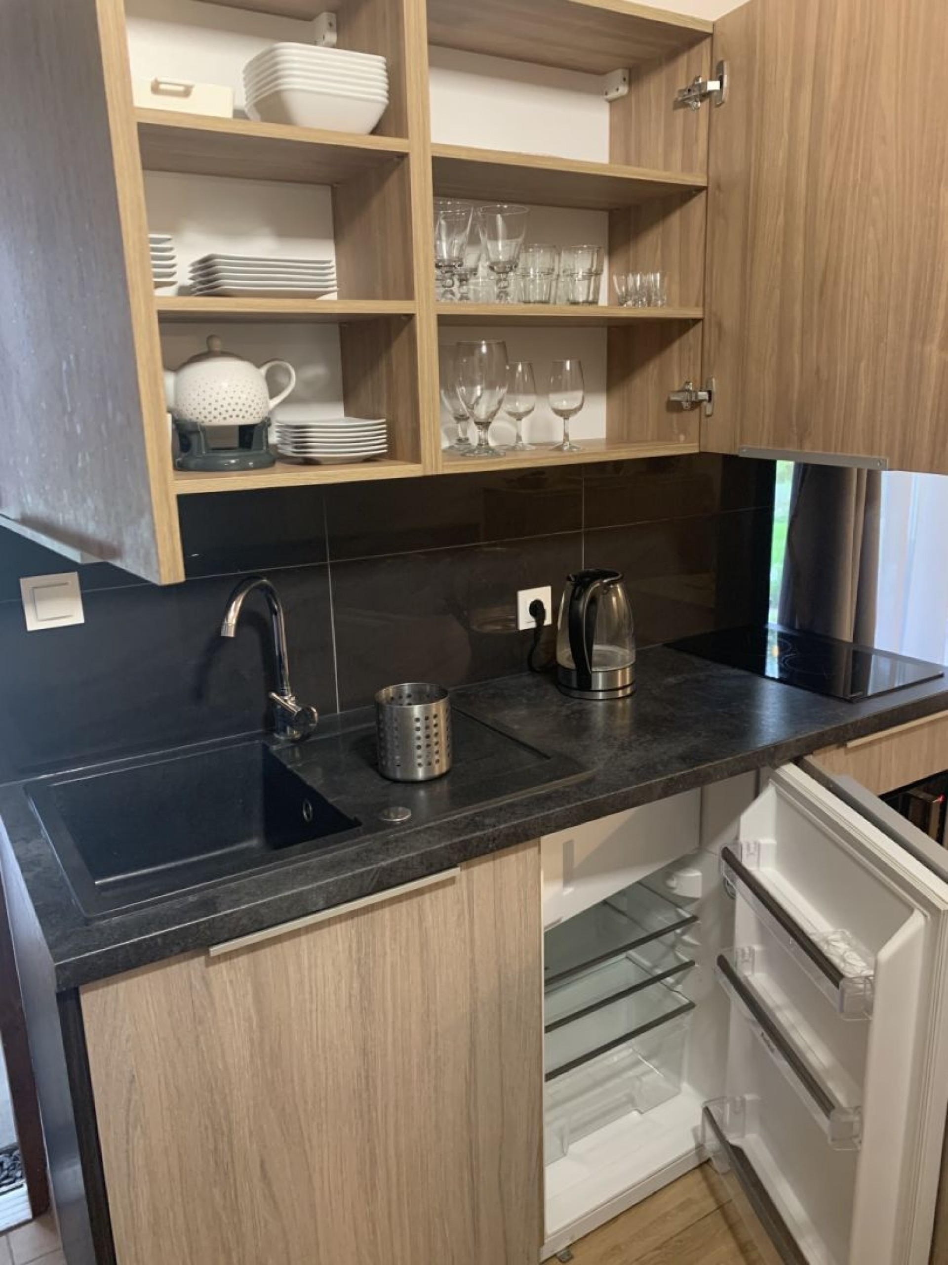 W salonie znajduje się telewizor oraz rozkładane kanapy, bardzo wygodne do spania. Salon posiada w pełni wyposażony aneks kuchenny, w którym znajdą Państwo zarówno lodówkę, mikrofalówkę, płytę kuchenną, czajnik, jak i zestaw najpotrzebniejszych naczyń, a także stół i cztery krzesła. Bezpośrednio z salonu mamy wyjście na murowany taras z meblami ogrodowymi.