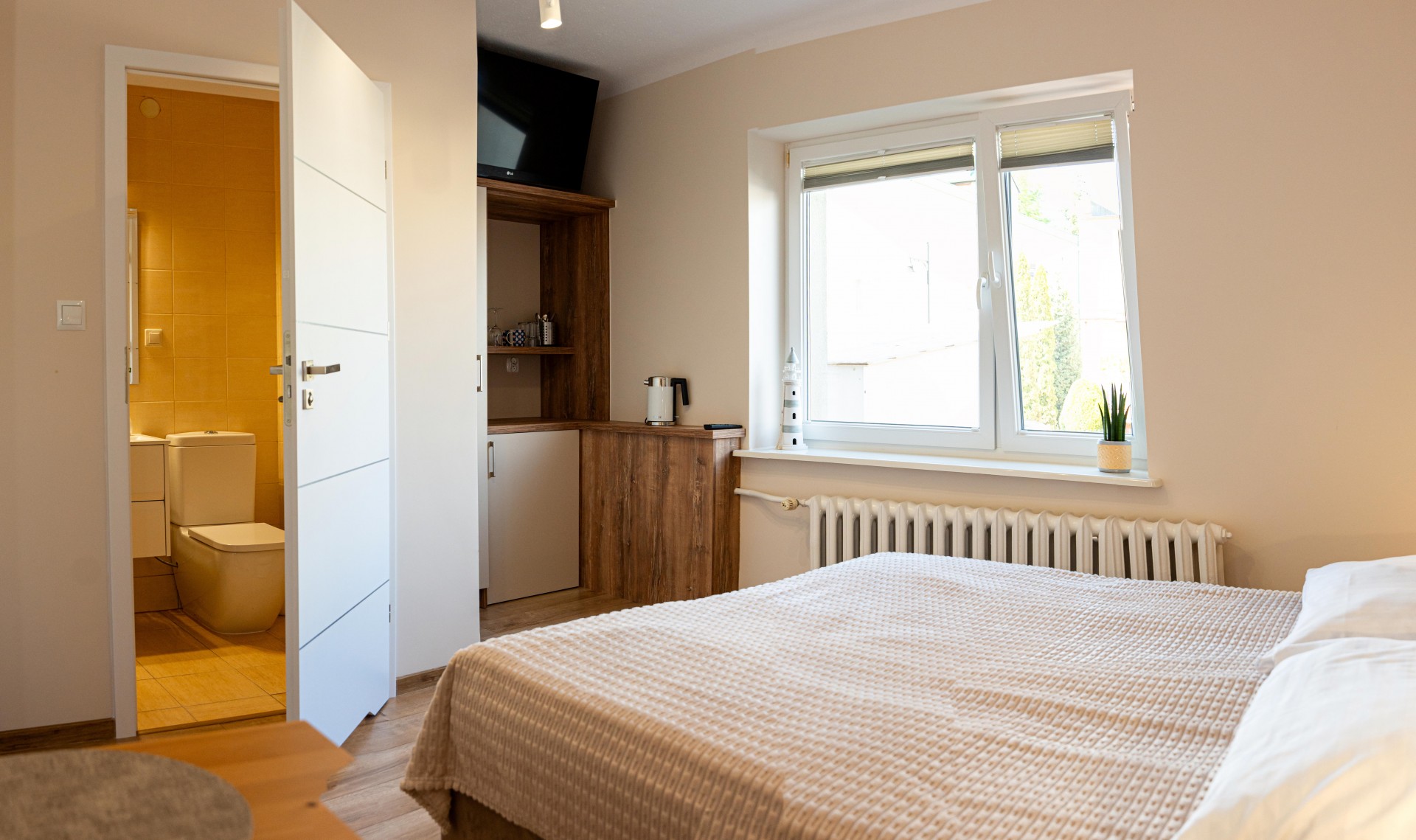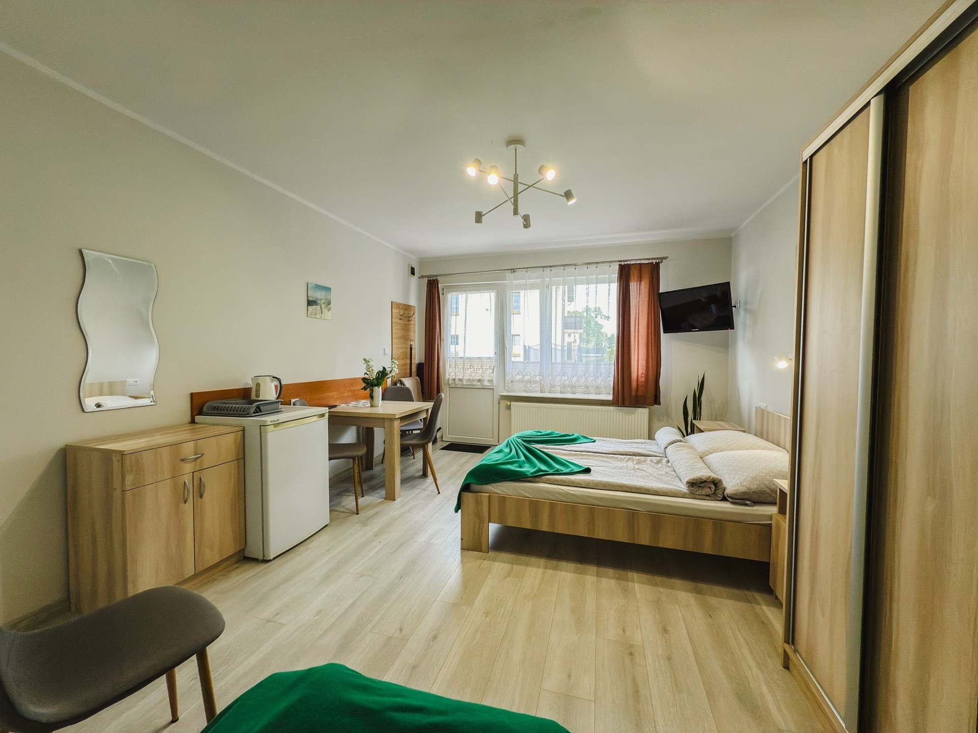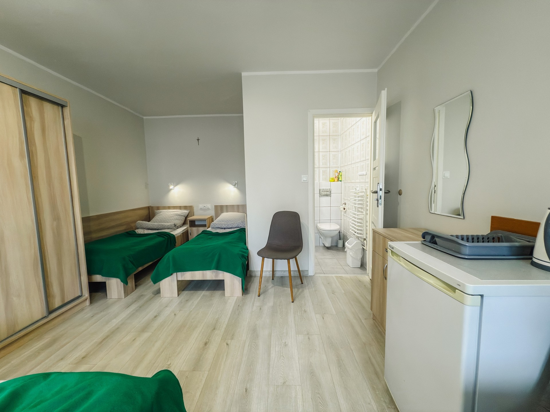 Standardem jest także łazienka z kabiną prysznicową. We wszystkich pomieszczeniach dostępne jest bezprzewodowe łącze internetowe.