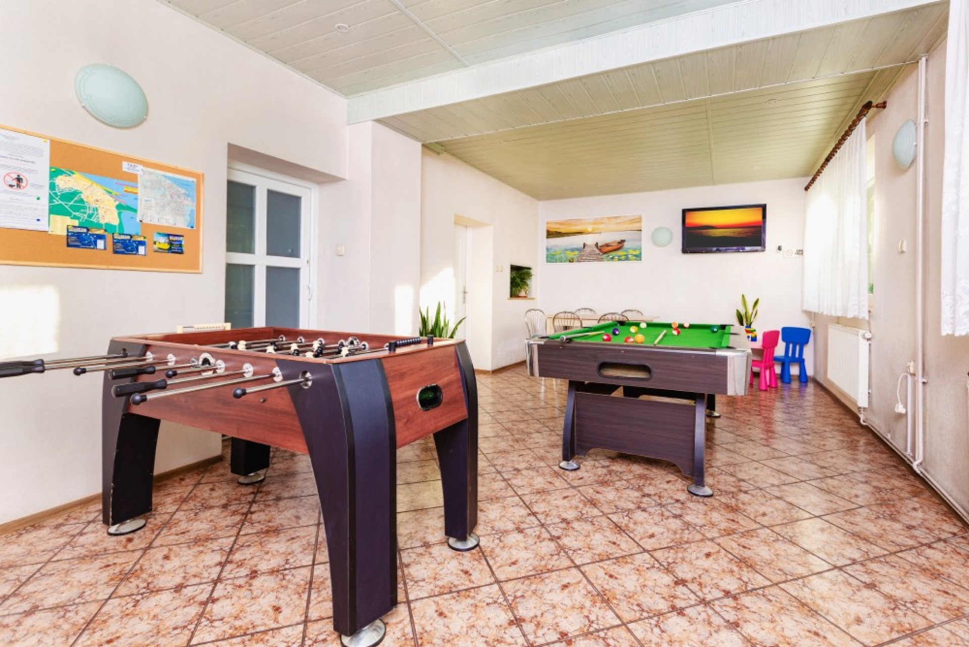 Dodatkowo w budynku przygotowaliśmy kolorowy pokój zabaw z grami i zabawkami edukacyjnymi dla najmłodszych. Urlopowicze mogą też korzystać z szerokiej oferty rekreacyjnej: stołu do bilarda, piłkarzyków, cymbergaja, stołu do ping-ponga.