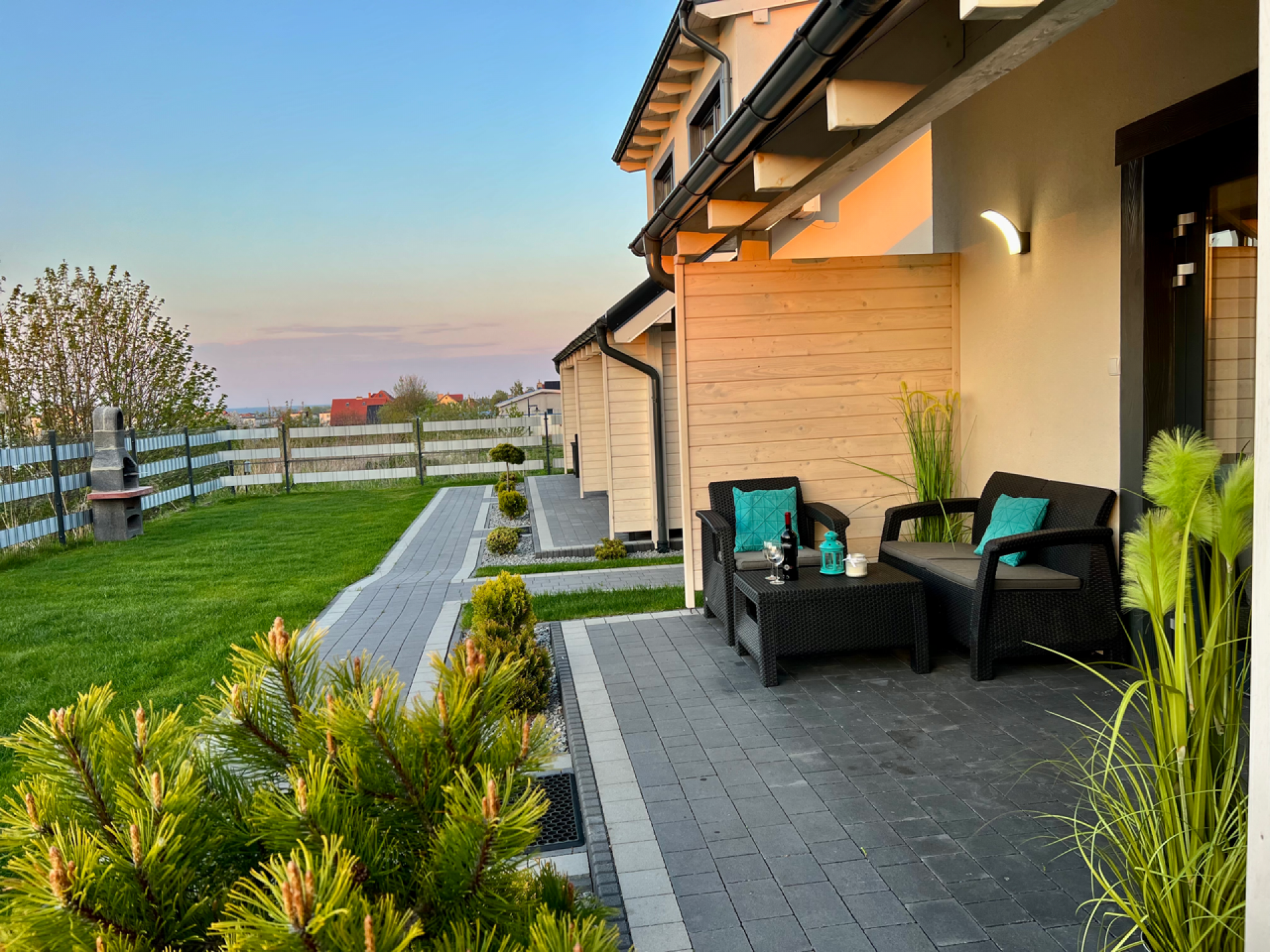 Nasze domki są murowane składające się z dwóch kondygnacji w pełni wykończone w drewnie co nadaje ciepła oraz komfortu. Każdy domek posiada własny taras wyposażony w meble rattanowe.